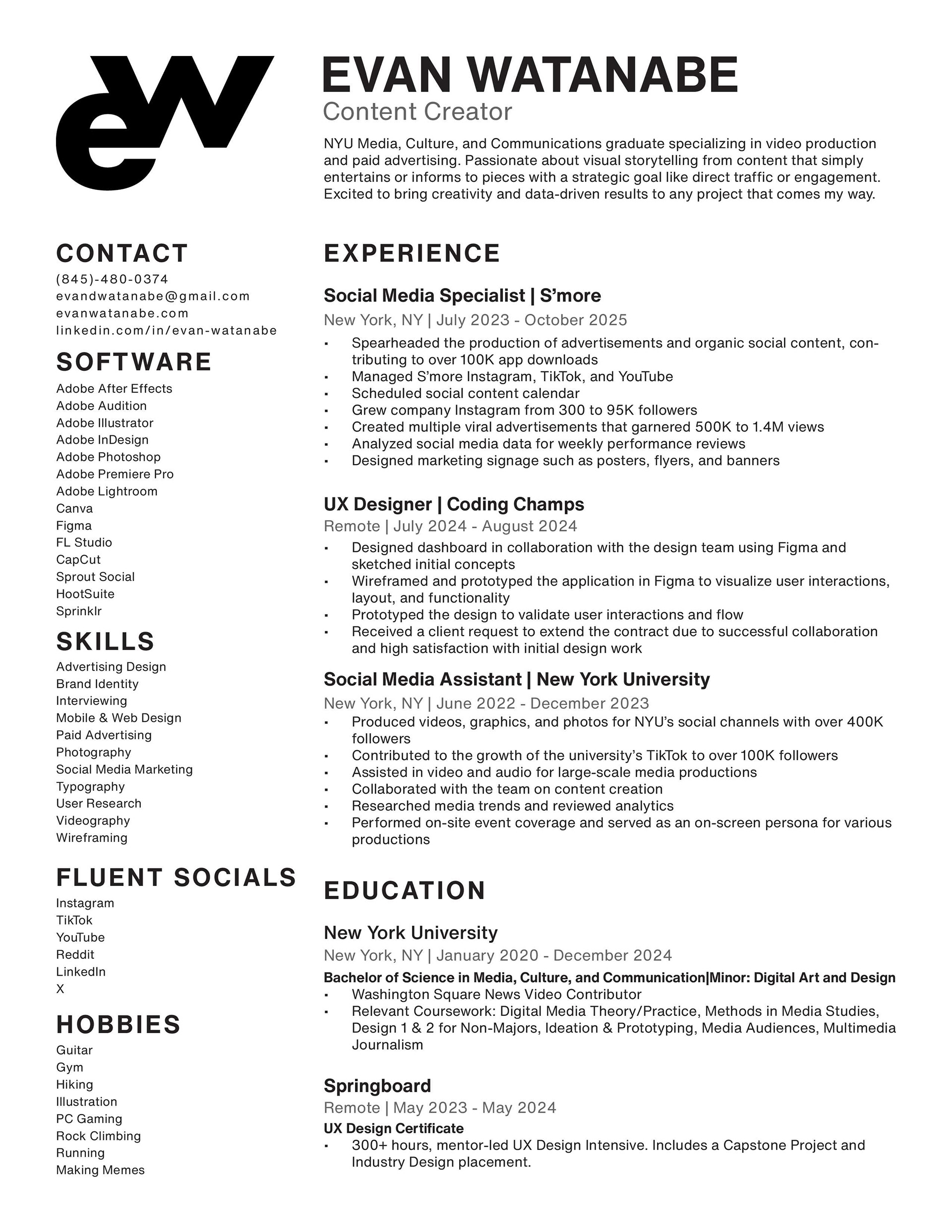 I'm passionate about visual media and specialize in social media video production and graphic design. Outside work, I'm an avid guitarist, gym-goer, gamer, and rock climber.